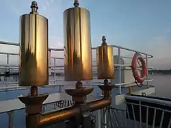 American Queen was a Louisiana-built river steamship said to be the largest river steamboat ever built.[3] American Queen's primary mode of propulsion is its stern paddlewheel powered by a steam engine extracted from the 1932 dredging vessel Kennedy.[4] Her secondary propulsion, which provides additional maneuverability and speed, comes from a set of diesel-electric propellers known as Z-drives on either side of the sternwheel. There are also two bow thrusters that offer better maneuverability when docking or treading water.[5] She has 222 state rooms for a capacity of 436 guests and a crew of 160. She is 418 feet (127 m) long and 89 feet (27 m) wide.[6]