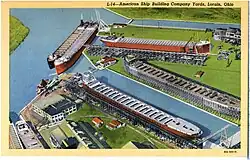 The American Ship Building Company was the dominant shipbuilder on the Great Lakes before the Second World War. It started as Cleveland Shipbuilding in Cleveland, Ohio,[1] in 1888 and opened the yard in Lorain, Ohio, in 1898.[2] It changed its name to the American Ship Building Company in 1900, when it acquired Superior Shipbuilding, in Superior, Wisconsin; Toledo Shipbuilding, in Toledo, Ohio; and West Bay Shipbuilding, in West Bay City, Michigan. With the coming of World War I, the company also acquired Buffalo Dry Dock, in Buffalo, New York; Chicago Shipbuilding, in Chicago, Illinois; and Detroit Shipbuilding, in Wyandotte, Michigan. American Shipbuilding ranked 81st among United States corporations in the value of World War II military production contracts.[3]