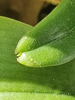 Amesiella philippinensis is a species of orchid endemic to the Island of Luzon in the Philippines.[2][3][4] Like Vanda falcata it was mistaken as an Angraecum species, due to the white, long-spurred flowers. The plant produces rounded leaces up to 5 cm in length. Three or four white, fragrant flowers of 3 cm in width are produced on short inflorescences. The labellum is yellow in the throat.[5] It occurs at lower altitudes than Amesiella monticola and has a shorter spur.[6]
