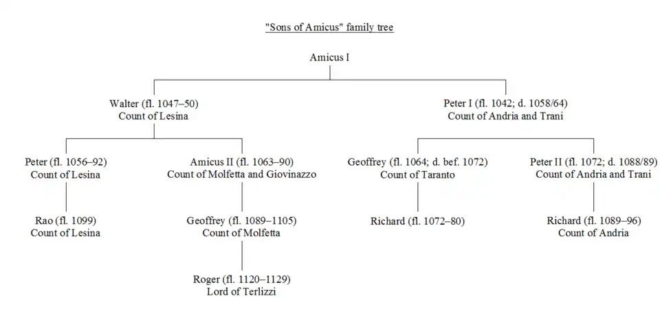 Amicus II belonged to a family known to modern scholars as the "sons of Amicus". His grandfather and namesake, Amicus I, lived in Normandy before 1030. Two of the latter's sons, Walter and Peter I, arrived in Italy before 1038. Walter was the father of Amicus II and Peter of Lesina. Amicus was thus the first cousin of Peter I's sons, Geoffrey of Taranto and Peter II of Trani.[1] The family was related—how is not known—to the Hauteville family.[2]