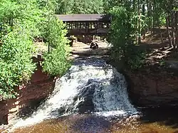 Amnicon Falls State Park includes two major waterfalls along the river. The two waterfalls highlight the Douglas Fault, which separates basalt and sandstone formations in the area. The Upper Falls flow over basalt, while the Lower Falls flow over sandstone.[3]
