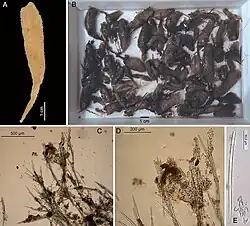| Amphilectus utriculus sp. nov. A,C-E. Holotype ZMA Por. 22592. B. Paratypes ZMA Por. 06636. C. Cross section showing skeletal structure. D. Peripheral skeleton showing protruding spicule tracts and clusters of microscleres. E. Spicules in light microscopy. | |