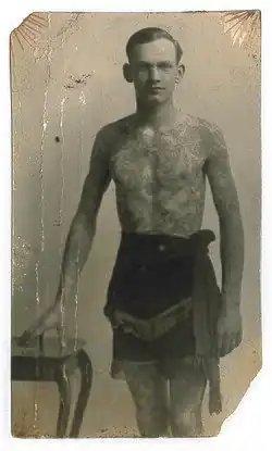 After working in Quebec for two months, Dietzel hopped a train and moved to New Haven, Connecticut.[2][6] In New Haven, he took some art classes at Yale University while working as a tattoo artist at night.[7] He wanted to be a fine-art painter, but he could not afford to continue studying art at Yale, so he became a full-time tattoo artist instead.[7] Around this time, he started using an electric tattoo machine.[6] He made friends with William Grimshaw, an English immigrant who was also a developing tattoo artist.[1][2] Grimshaw gave Dietzel a suit of tattoos, and Dietzel may have tattooed Grimshaw in return.[8] Together, they performed in traveling carnivals and circus sideshows as tattooed men, where they sold photos of themselves and tattooed customers in between shows.[1][5] Dietzel and Grimshaw used tattoo ink made with carbon black, "China red" (vermilion), "Casali's green" (viridian), Prussian blue, and a yellow pigment that may have been arylide yellow.[9]