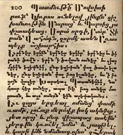 According to Theo van Lint, poets starting from the 13th century wrote in genres that were freed from various poetic forms existing in the church.[86] The range of topics they covered expanded.[132] Gradually, religious tendencies receded into the background,[11] and love poetry flourished.[10] P. Cow divided it into two categories: those that praise the physical qualities of the beloved woman (praise) and those that tell of unrequited love (lament).[133] Cultural trends of the time were often influenced by political, economic, and military events.[9] Despite the difficult conditions of the 13th to 16th centuries, thanks to cultural and educational centers both in Armenia and in the Diaspora, the accumulated intellectual heritage was preserved. New monuments of poetry were created, and the developing translated literature continued to enrich the national literature.[11] In monasteries, students were taught to compose poetic works. Special "dictionaries" were compiled for use in poetry.[128] Collections of poems called "Tagharan" were also written there.[134] An important event in cultural life was the emergence of Armenian printing in Venice in 1512. Literature became even closer to life. Middle Armenian became the dominant literary language instead of the endangered classical grabar. The proportion of poetic speech increased, as did its social and ideological significance in literature. Becoming the heritage of the masses, lyricism became even closer to folklore, finding common ways of connection with folk songs, their way of thinking, and character creation. The commonly used poetic forms were praise, lament, exhortation, lamentation, nativity, and kapkh, which discussed themes of love, nature, social status, wandering, and morality. In these works, the sorrow of the people, personalities, patriotic feelings, and philosophical reflections on the social situation, death, soul, and body were expressed. Numerous epic, epic-lyrical, and didactic poems were created, dedicated to heroic periods or individual characters throughout the history of Armenia.[11] According to K. Bardakchyan, "both in allegorical poems and in patriotic works of the past, there was a certain hope for revival".[81] Poetic developments based on themes from the Sacred Book were made, as well as artistic descriptions of various scientific issues.[11]