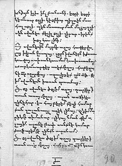 If early spiritual hymns were characterized by limited lyrical dimensions, the hymns of developed feudalism stood out for their greater diversity. One of the main poetic forms of early medieval hymns was the complex tetrameter iambic quatrain. In the same period, the tetrameter anapest gained significance.[62] An example of this is the work of Komitas Aghtetsi.[63] Grigor Narekatsi and Grigor Magistros, who lived in the 10th-11th centuries, already employed secular dimensions.[64] Narekatsi wrote several chapters of his poem in "native dimensions". Nerses Shnorhali made a significant contribution to the development of Armenian calligraphy in the 12th century. Some calligraphic forms he developed even transitioned into modern Armenian literature. Quatrains were most common in works with a strophic structure. Armenian grammarians from the 5th to the 17th centuries, such as Movses Kertogh, David Kerakan, Vardan Mets, Esai Nseci, and Simeon Jugaeci, delved into theoretical questions of rhyme, syllabic writing, and rhyming.[65]