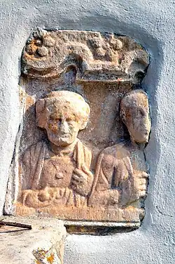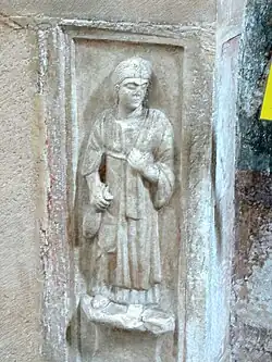 On a first century AD Celtic gravestone from Wölfnitz, a girl is depicted in Norican clothing. It consists of a straight under-dress (Peplos) which reaches to the ankles, a baggy overdress reaching to the knees, which is fastened at the shoulders with large fibulae. A belt with two ribbons hanging down at the front holds the dress in place. In her right hand she holds a basket, in her left hand she holds a mirror up before her face. On her feet there are pointed shoes. Her hair is mostly straight, but coiffed at the back.[77]