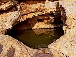 The Egyptians operated a copper mine in the Timna Valley, as evidenced by a Hathor temple from that period.[33] After the Egyptians withdrew, another group took over the copper mine. This group also constructed a fortress-like road station at the Yotvata oasis, notably using the casemate building technique,[34][35] and established another copper mine at Khirbet en-Nahas.[36]