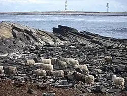![]() Sheep on the rocky shore at Ancumtoun, with the North Ronaldsay lighthouse in the distance | |