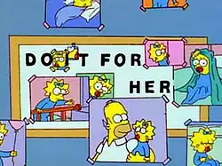 In the episode, Mr. Burns places a "de-motivational plaque" in Homer's station that reads "Don't forget: you're here forever". Homer then places photos of Maggie around the plaque to alter it into saying "Do it for her".[5] The Simpsons writer George Meyer, who enjoys writing jokes that involve anagrams or any other forms of word play, came up with the idea for this particular joke.[5] The joke is also an homage to Al Jaffee's Fold-in features in the Mad magazine.[6]