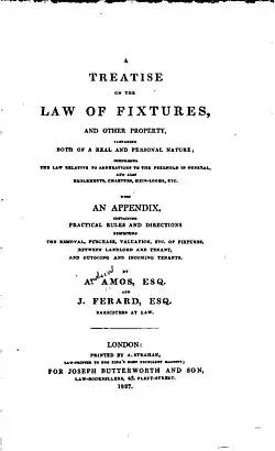 4. ^ Andrew Amos; Joseph Ferard (1827), A Treatise on the Law of Fixtures: And Other Property Partaking both of a Real and Personal Nature: Comprising the Law Relative to Annexations to the Freehold in General ... with an Appendix, Containing Practical Rules and Directions Respecting ... Fixtures ..., London: John Butterworth and Son, OCLC 60719569