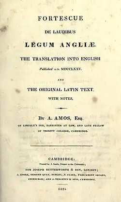 The title page of John Fortescue's De Laudibus Legum Angliæ: The Translation into English Published A.D. MDCCLXXV (1825), which Amos edited