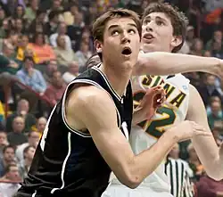 During his sophomore year, Smith played in all 38 games, starting 32.[2] After Butler got off to a mediocre 3–2 start, Smith was added to the starting lineup.[1] Against Cleveland State, he scored a career-high 22 points and collected 10 rebounds to get his first collegiate double-double. In the final game of the regular season, he played a career-high 36 minutes and recorded 11 rebounds, 3 steals, and 3 blocks, all career highs.[2] Thanks in large part to Smith's emergence as a starter, Butler returned to the NCAA Tournament.[4] During the round of 32, Smith hit a go-ahead basket with less than 3 seconds on the clock to help Butler beat top seeded Pittsburgh.[2] In Butler's sweet 16 match against Wisconsin, Smith hurt his ankle and left the game.[4] However, he returned before the game's end, collecting eight points and six rebounds as Butler advanced to the regional final.[4] Butler again advanced to the Championship game. Smith led the team in rebounding in the regional final against Florida and in the National Championship game against Connecticut.[2] He finished the year as the team's second-leading rebounder (5.6 per game) and third-leading scorer (8.5).[2][7] He made 59.3% of his field goal attempts and 67.3% of his free throws.[7]