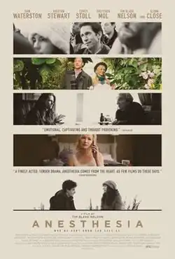 Anesthesia is a 2015 American indie drama film written, produced and directed by Tim Blake Nelson. Nelson stars in the film with Sam Waterston, Kristen Stewart, Glenn Close, Gretchen Mol, and Corey Stoll. The film premiered at the Tribeca Film Festival on April 22, 2015.[2] The film was released in a limited release and through video on demand by IFC Films on January 8, 2016.[3]