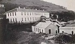 Angel Island Immigration Station, sometimes known as "Ellis Island of the West," began construction in 1905 and opened January 21, 1910. Construction of the facility involved leveling a former Coast Miwok village site and shell mound, including the interred remains of numerous people.[8] The main difference between Ellis Island and Angel Island was that the majority of the immigrants that traveled through Angel Island were from Asian countries, such as China, Japan, and India. The facility was created to monitor the flow of Chinese immigrants entering the country after the implementation of the Chinese Exclusion Act in 1882. The Act only allowed entrance to merchants, clergy, diplomats, teachers, and students, barring laborers.[6]
