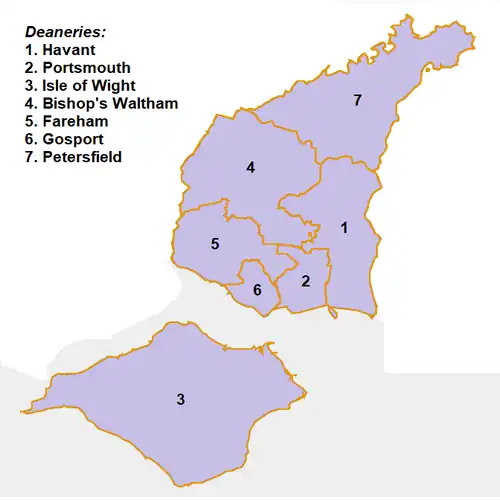 The Diocese of Portsmouth was created on 1 May 1927[1] under George V from the Diocese of Winchester. It consists of the three archdeaconries of: