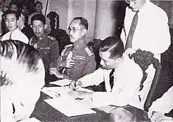 The main effect of the peace treaty was to undo the Thai annexation of the Shan States and four of the Unfederated Malay States.[2] The British achieved less than they had hoped, largely because the United States opposed any punitive action against Thailand. They were unable, for instance, to reduce the size of Thai armed forces.[3] The treaty did require the free delivery of up to 1.5 million tons rice, which was in surplus in Thailand, to British Malaya, where there was a shortage.[4] It also forbade the Thais from building a canal across the Kra isthmus without British government permission, which clause undercut the authority of Pridi Banomyong's government.[5][6]
