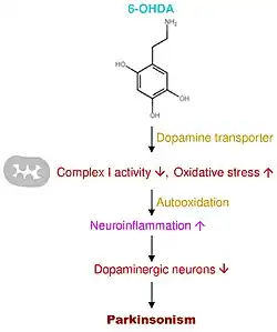 - ^ Hernandez-Baltazar, D.; Zavala-Flores, L.M.; Villanueva-Olivo, A. (2017-10-01). "The 6-hydroxydopamine model and parkinsonian pathophysiology: Novel findings in an older model". Neurología (English Edition). 32 (8): 533–539. doi:10.1016/j.nrleng.2015.06.019. ISSN 2173-5808. PMID 26304655.