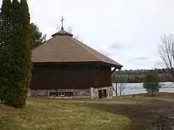 Within the M'Chigeeng First Nation in Manitoulin District is the Church of the Immaculate Conception. It is situated across the street from the Ojibwe Cultural Museum. The original church structure was founded in 1854, by a Fr. Fremiot, but has its roots in the Jesuit missions to the island in 1648–1650. In 1971, the original building was destroyed in a propane tank explosion. The new building, constructed in 1972, was influenced by the Second Vatican Council's decrees on liturgy. It is a round building, with a conical roof; the shape of a teepee. Inside the church, the stations of the cross were painted by Leland Bell.[7][8][9]