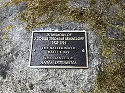 Beyond her career as a dancer, Audree Thomas was the inspiration for the name of a small bay on remote Nelson Island, 60 miles up the B.C. coast from Vancouver, on the traditional lands of the Sechelt (shíshálh) First Nation.[18] Shortly after she joined the Ballet Russe de Monte Carlo, her parents, Harry and Marjorie (Midge) Thomas, set up a homestead there. Midge called their new home Ballet Bay in honor of their daughter, the name becoming official a few years later.[19] [20] Audree's ashes were scattered in Ballet Bay[21] and a plaque in memory of “The Ballerina of Ballet Bay” sits on a low rock bluff at the back of the bay.
