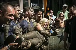Members of the 24th Marine Expeditionary Unit hold up Kooiman after an obstacle course during Fleet Week New York in 2016