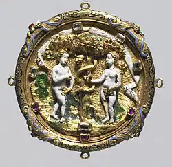 The Walters Art Museum in Baltimore has a Tudor hat badge depicting Adam and Eve, though its inscription is now mostly effaced,[49] and Sir Thomas Palmer's New Year's Day gift from Henry VIII in 1532 was a tablet of gold with a device of Adam and Eve and a hanging pearl.[50] Anne Astley was also to have a ruby ring that had been a gift from Henry Clifford, 2nd Earl of Cumberland, whose daughter Margaret Clifford was briefly a maid at Mary's court before her marriage to Henry Stanley, 4th Earl of Derby.[51]