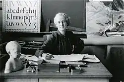 Anne Savage sitting at her desk, 1940