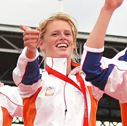She returned to the eights in 2007 rowing to two third positions in the World Cup in Linz and Luzern as well as the first place in Amsterdam with Jacobine Veenhoven, Smulders, Hurnet Dekkers, Van Rumpt, Roline Repelaer van Driel, Sarah Siegelaar, Dekker and Workel.[2] Then at the World Championships in Munich the team failed to achieve the A-final and had to be satisfied with the 7th position overall.[2] In 2008 the team tried to qualify for the 2008 Summer Olympics and at the first World Cup in Munich Veenhoven was replaced by Nienke Dekkers while Hurnet Dekkers was replaced by Nienke Kingma; they finished in fourth position.[2] Helen Tanger replaced Nienke Dekkers in the second meeting held in Luzern and another fourth position was achieved. This also meant the Olympic qualification was accomplished.[2] At the 2008 Olympics, the Dutch team containing de Haan won the silver medal.[3]