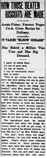 Annie Knowles Fisher (December 3, 1867 โ€“ June 11, 1938) was a cook, caterer and entrepreneur. Annie lived in Columbia, Missouri, and worked for prominent families as a cook until she started her own catering business. Fisher became famous in Missouri for her widely sold beaten biscuits. Through her cooking, Fisher amassed a sizable fortune and purchased rental properties and farms in and around Boone County.