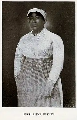 Fisher was considered by those who met her to be a strong, witty, outspoken businesswoman. In 1919, Fisher gave a speech at a meeting of the National Negro Business League.[7] In her speech, Fisher taught how to make a profit from catering and about her life growing up. She said she was a 57-year-old woman who was not afraid to tell her age.[2]