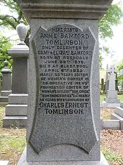Tomlinson stopped editing Women's Outlook[2] and died soon after in Blackpool in 1933. She was buried in her home town.[1] Her husband Charles Ernest Tomlinson, who she had married nearly 30 years before, had a gravestone made that recorded her achievements.[3]
