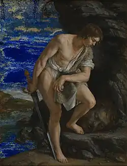 According to Riccardo Lattuada, co-editor of a catalogue raisonné of the works of Orazio and his daughter Artemisia[3] and author of the work's auction notice in 2016, alabaster was frequently used as a support in Florentine School painting in the late 16th and early 17th centuries. The technique was rarely used by Orazio, though he did paint a Madonna Presenting the Christ Child to Saint Francis on marble (which was formerly in the Hessisches Landesmuseum in Darmstadt but was probably destroyed during the Second World War[2]) and a David Contemplating Goliath's Head on lapis lazuli (now in a private collection after only reappearing on the art market in 2012 and going unmentioned in the analysis of paintings of the same title[4] in the 2001 catalogue published by the Metropolitan Museum of Art).