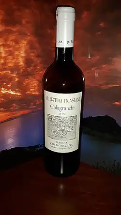 Ansonica Costa dell'Argentario is a dry Italian white wine from the region of Tuscany, Italy. Ansonica is made from the Ansonica (Inzolia) grape. The DOC is located on the extreme southern coast of Tuscany and on the island of Giglio. The DOC was created in 1995, and allows for a minimum of 85% Ansonica and a 15% maximum of other white grapes in the blend.[1]