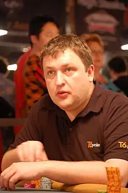 As a child, Guoga was the Rubik's Cube champion of Lithuania before moving to Melbourne, Australia, at the age of 11.[15] He has played poker since the age of 18, and is known for his outlandish table talk and frequent attempts at intimidation of his opponents. He had a fifth-place finish in the World Poker Tour Grand Prix de Paris 2003.[16] He finished in the money twice at the 2004 World Series of Poker in Seven-card stud and Pot Limit Texas hold 'em tournaments.[17][18] Three months later he earned his then biggest tournament money finish in the WPT Grand Prix de Paris 2004, where his second-place finish to England's Surinder Sunar earned him $414,478.[19] He finished on the bubble later in the same month at the WPT 2004 Mirage Poker Showdown.[20] On 7 August 2005 he won the £5,000 no-limit Texas hold 'em Main Event of the European Poker Championships, earning £260,000.[21] Later in 2005, he made the final table of the World Speed Poker Open.[22]