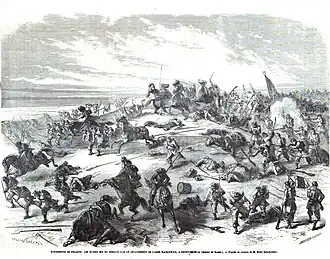 Priest Mackevičius set off in the direction of Panevėžys, and on the way joined up with the Kończa party, but they soon separated. On 19 July, near Panevėžys, he tried to break up a Russian convoy - unsuccessfully, but he succeeded in a night attack on the Russian guard. There was also a successful skirmish near Bistrampolis Manor on the night of 31 July/1 August.[22] The next major skirmish of Mackevičius's unit was the victorious battle of Kėdainiai on August 12. In the next battle, at Buda on August 20, the Russians had a six-fold advantage over the 120 partisans and, despite fierce defence, forced them to retreat.[22] At the end of August, Konstanty Kalinowski, extraordinary commissioner of the National Government for Lithuania, appointed Mackevičius political commissar of the Kaunas voivodeship, and Ignacy Laskowski head of the Kaunas voivodeship.[22]