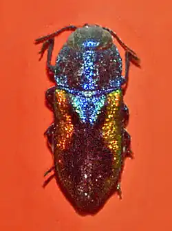 Anthaxia lucens can reach a length of 6–8 millimetres (0.24–0.31 in). This species has a bright elytral coloration, with longitudinal orange stripes on a metallic bluish-black background. Male's metatibiae are almost straight.[2] Larvae feed on Prunus domestica, Armeniaca vulgaris and Prunus cerasus.[3]