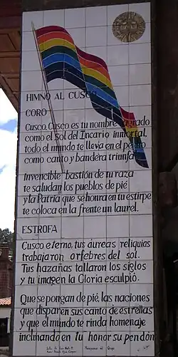 ![]() Lyrics of the anthem of Cusco on a plaque in the Portal de Carrizos of the Plaza de Armas of Cusco | |