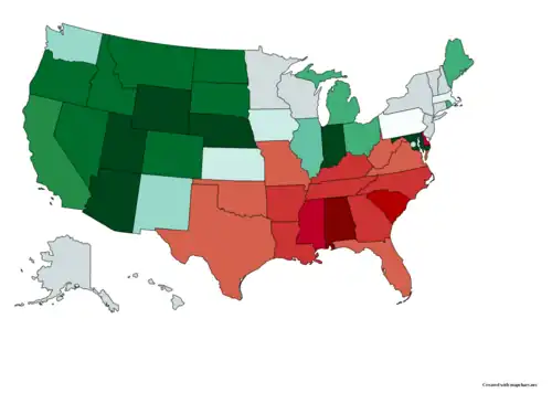 In the United States, many U.S. states historically had anti-miscegenation laws which prohibited interracial marriage and, in some states, interracial sexual relations. Some of these laws predated the establishment of the United States, and some dated to the later 17th or early 18th century, a century or more after the complete racialization of slavery.[1] Nine states never enacted anti-miscegenation laws, and 25 states had repealed their laws by 1967. In that year, the U.S. Supreme Court ruled in Loving v. Virginia that such laws are unconstitutional under the Fourteenth Amendment to the U.S. Constitution.[2][3]