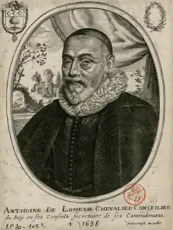 Antoine de Lomenie, lord of La Ville-aux-Clerics (1560 - 17 January 1638 Paris) was a Secretary of the Navy under Louis XIII of 7 November 1613 to 10 August 1615, and Ambassador Extraordinary of France to England.