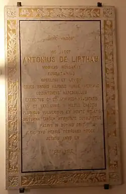 Anton Lipthay de Kisfalud (1745 – 17 February 1800), also Anton Liptai or Anton Liptay, served in the Austrian army, attained general officer rank, and fought in several battles against the French army of Napoleon Bonaparte during the French Revolutionary Wars.