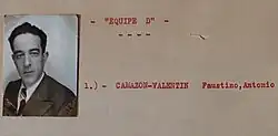 After the war, he ended up in a French concentration camp, where he managed to smuggle out a letter to French intelligence, the Deuxième Bureau, headed by George Bertrand.[2][3] The "Team D" was composed of seven Spanish exiles from the Republican secret service (five officers and two commissioners), and was led by Camazón. He became head of the Spanish team at PC Bruno (Poste de Commandement Bruno), which worked to break the cipher used by the Germans during World War II with the help of 15 Polish and 9 French cryptographers. The French secret service had been informed about the Polish advances against Enigma by cryptographers who had fled the invasion of Poland: Marian Rejewski, Jerzy Różycki, and Henryk Zygalski,[3] who joined Bertrand's team alongside the French and Spanish cryptographers.