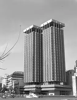 Lamela introduced in Spain the concept of "suspended architecture" [7] with the Torres Colón project in Madrid, undertaken together with the engineer Fernández Casado. The structural system of the towers was completely designed in reinforced concrete using high strength post-tensioned concrete. In this way, it departed from the most widespread technique of constructing "hanging" buildings, which usesheads of structural steel, to instead adopt a "suspended architecture" solution: the floor slabs are supported at their perimeter by the outer tie rods, which are not tensioned as in the case of the "hanging architecture", but compressed against the post-tensioned concrete structure of the head-beams. This upper structure, within which the installation machinery is located, receives the load from the 21 suspended slabs and transmits it to the core, through which it finally descends to the foundations in the ground. When they were built, the Colón Towers heldthe world record for the number of suspended slabs, 21, using the pre-stressed concrete technique. The result is a building one hundred metres tallwith twenty suspended floors. The Eduardo Torroja Institute presented this project as a Spanish technological contribution at the World Congress of Architecture and Public Works held in New York in 1975, and it was considered "the building with the most advanced construction technology until 1975." Torres Colón as they looked when finished in 1976.
