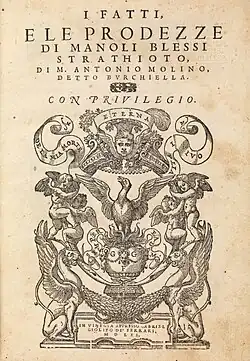 In 1561, Molino published a lengthy comic poem in eight cantos, I fatti e le prodezze di Manoli Blessi strathioto, dedicated to Giacomo Contarini. Written in Venetian with some greghesco, it is about the fiction Greek soldier Manoli Blessi.[3] In 1564, musical settings of his poetry in greghesco were published in Il primo libro delle greghesche, with contributions from Gabrieli, Merulo, Rore, Willaert and Annibale Padovano.[5]