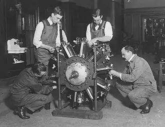 By 1912 Anzani had built the world's first two row radial engine, the 10 cylinder Anzani 10, which came in two sizes, the bigger 12.1 litre one producing 100-110 hp. By the middle of 1913 the company had a double version with four rows of five cylinders, rated at 200 hp called the Anzani 20.[1] This was displayed at the Paris show of that year[2] and had much in common with the ten cylinder engine. An air-cooled motor, its cylinders were made of cast iron, with integral cooling fins.[1] The pistons and their rings were also cast iron, machined inside and out.[3] Conical seats for the inlet and exhaust valves were ground into the flat cylinder head, the nickel steel valves being of the poppet type. The automatic, atmospheric pressure operated inlet valves of the earliest Anzani engines were retained, but, as in other later Anzanis the exhaust valves were push-rod and rocker operated.