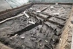 The Aoyakamijichi site was discovered along with the construction of the Aoya-Hago Road and the Tottori Prefectural Road No. 274 Aoya Station Ide Line. Archaeological excavations since 1998 have revealed that the residential area was about 200 meters in diameter, and that paddy fields extended on the south and west sides for over 700 meters on the long side to about 300 meters on the short side, for a total of total of approximately 55,000 square meters. The settlement area began in the latter half of the early Yayoi period, expanded significantly in the latter half of the middle Yayoi period, continued to the latter period, and suddenly disappeared at the beginning of the early Kofun period. The overlapping foundations of numerous pillar-supported buildings and underground storage pits were found. However, the most unusual feature is a revetment facility made of massive cedar planks from the middle and latter half of the Yayoi period that extends across the southeastern part of the ruins. It was made from huge boards with a length of 260 cm and a width of 70 cm arranged side by side and fixed with stakes. In the later period, a ditch was built to surround the high range of the terrain, and rows of sheet piles were driven in many layers here. Some of these revetment facilities include planks that appear to have been converted from building materials. The site also yielded a very large number of artifacts. In addition to finished and unfinished woodware, bone and horn tools, animal bones, and metalware such as ironware and bronze ware, more than 5,300 human remains were also unearthed. Initial DNA testing on five of these remains revealed that two of the remains had markers of Haplogroup C-M8, which are mostly unique to Japanese populations. One of the remains belonged to Haplogroup D, another typically Japanese haplogroup presumed to derive from Jōmon period populations of the archipelago, and another one of the remains belonged to haplogroup O-M175. The Y-DNA haplogroup of the fifth specimen could not be determined. Subsequently, five more male specimens were tested; of these, two were assigned to Y-DNA haplogroup D (one of these more precisely to haplogroup D1b), two were assigned to haplogroup O1b2a1 (O-K10/O-F1204, one of which was assigned more precisely to the typically Japanese subclade O1b2a1a1), and the Y-DNA haplogroup of the last specimen could not be determined. Not only the Y-DNA, but also the mtDNA of specimens from Aoyakamijichi is similar to that of present-day Japanese: B4b1a1b x1, B4c1a1a1a x1, B4f x1, B5b1a2 x1, C1a x1, D4a1a1 x1, D4a2a x1, D4b2b1 x5, D4b2a2 x4, D4b2 x1, D4c1b1 x1, D4c1b2 x1, D4c2 x1, D4g1a x1, D4g1c x1, D5a1a1 x1, G1a1a2 x1, M7a1a1a x1, M7b1a1a1 x4 or x5 (one has been confidently determined only so far as M7b1a1), M9a1a1 x1, N9a2a x3, N9a2d x1, N9b x2. The mtDNA haplogroups of three samples have been indeterminable, though one of these may most likely belong to haplogroup M7b1a. Among the late Yayoi period bones found in a ditch on the east side of the site, 110 had wound marks. In addition, two bones are found to have lesions caused by vertebral caries, making these the oldest known tuberculosis case in Japan. Three skulls were found to contain organic materials that are the remnants of brain material. Another important find was a 120-cm fragment of a wooden shield made from momi fir, which had been painted green. This is the earliest known use of green pigment in East Asia. As many as 35 coprolites were unearthed, which also provides important knowledge for restoring the lives of people in the Yayoi period. Many of the relics indicate a relationship with the Asian continent, hinting at trade and cultural exchange during the Yayoi period across then Sea of Japan.[2]