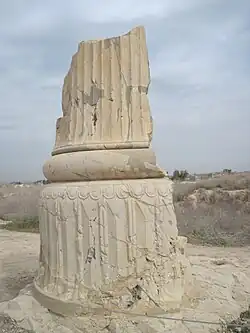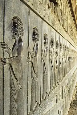 Apadana (Old Persian: 𐎠𐎱𐎠𐎭𐎴, [apəˈdänə] or [äpəˈdänə]) is a large hypostyle hall in Persepolis, Iran. It belongs to the oldest building phase of the city of Persepolis, in the first half of the 5th century BC, as part of the original design by Darius the Great. Its construction was completed by Xerxes I. Modern scholarship "demonstrates the metaphorical nature of the Apadana reliefs as idealised social orders".[1]