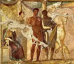 Scholars in the nineteenth and twentieth centuries believed that the cult of Aphrodite may have involved ritual prostitution,[98][96] an assumption based on ambiguous passages in certain ancient texts, particularly a fragment of a skolion by the Boeotian poet Pindar,[99] which mentions prostitutes in Corinth in association with Aphrodite.[99] Modern scholars now dismiss the notion of ritual prostitution in Greece as a "historiographic myth" with no factual basis.[100]