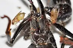 Apocephalus paraponerae is a species of fly in the family Phoridae discovered by Borgmeier in 1958. This species is a parasitoid of the giant tropical ant Paraponera clavata (commonly known as the bullet ant) and uses both visual and chemical cues to locate its host. A. paraponerae can locate fighting or injured ants through host-produced alarm pheromones.[2] Female flies are attracted to the ant to feed and oviposit, while males are attracted to feed and locate females for mating. There is some evidence that suggests that A. paraponerae is a cryptic species complex of at least four genetically distinct species.[3]