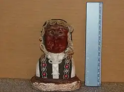 The doll is made in two parts: the head and the body. To make the head, an apple is peeled, then the flesh is carved or pressed using a spoon and paring knife to create the facial features of the doll. In some early examples, the facial features and expressions were produced by pinching the apple as it began to shrink.[6]