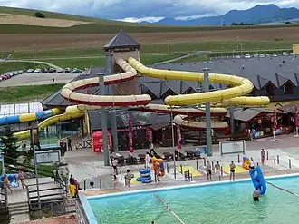 Aquapark Tatralandia Holiday Resort is the biggest aqua-park in Slovakia and one of the biggest in Central Europe. It is located 4 km north-west from town Liptovský Mikuláš in Ráztoky, on the north bank of dam Liptovská Mara. The source of the thermal water is a mineral spring coming from a 2500m deep bore with temperature of 60.7 °C. There are 9 thermal pools, 6 of them are open all year-round; while 2 of them are covered, with water temperature around 38 °C. Located in the close proximity of the Tatra Mountains, the waterpark resort is open daily from 10am-10pm, and is open most of the year.