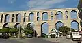 While the aqueduct is of Roman origin, the present structure was built by the Ottomans in the 16th century.[1] A Byzantine barrier wall of the early 14th century, built as part of the fortifications on the Acropolis of Kavala, probably also functioned as an aqueduct. If so, it would have been a rare example of a Byzantine aqueduct, since Byzantine cities more typically used wells and cisterns rather than either maintaining existing Roman aqueducts or building new ones.[2] The barrier wall was replaced with the present arched aqueduct during Suleiman the Magnificent's repair and improvement of the Byzantine fortifications. Some authors date that construction to the time of the 1522 Siege of Rhodes, but a more likely date is between 1530 and 1536.[3] As late as 1911, it supplied the city with drinking water from Mount Pangaeus.[4]